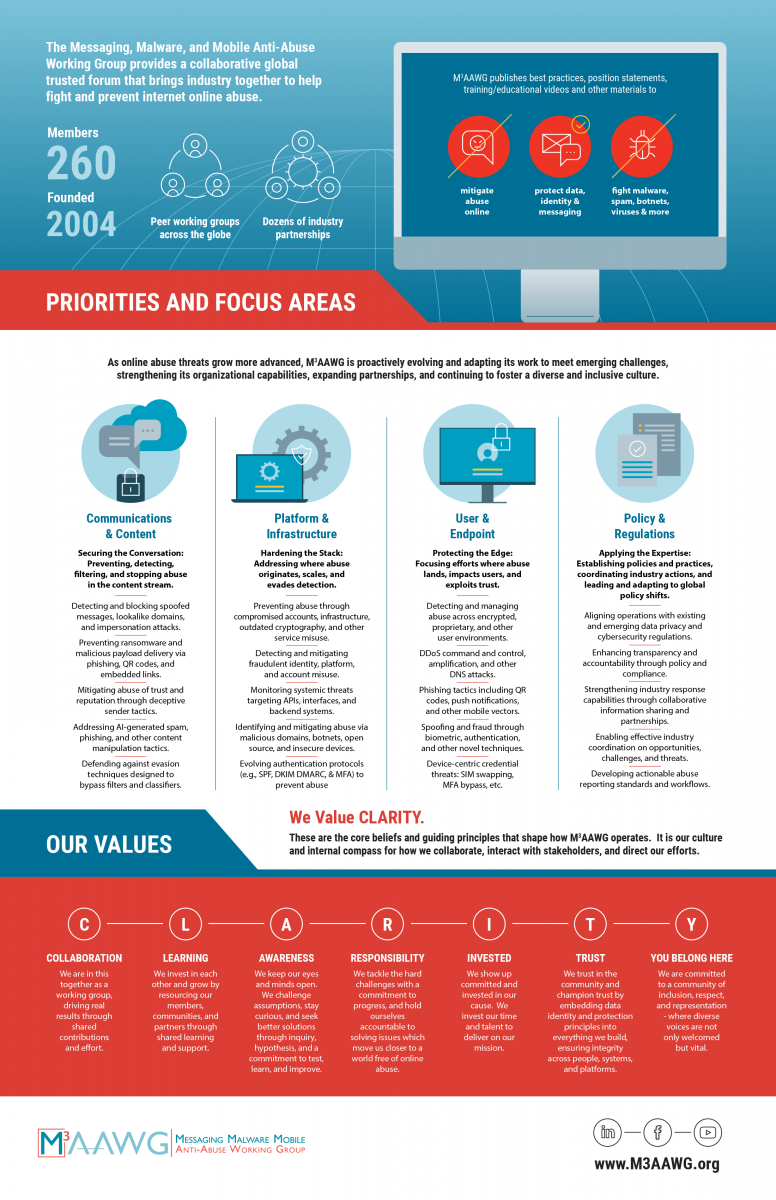 Additionally, we encourage you to stay tuned to this blog and follow M3AAWG on Facebook and LinkedIn for information about attending our upcoming Engagement Series, which will feature M3AAWG leadership sharing more updates on our strategic direction as we work to stay ahead of emerging threats and evolving abuse tactics.