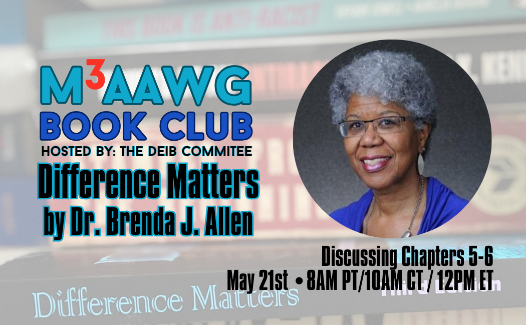 Join the conversation with M3AAWG's Book Club on May 21st. The group will discuss chapters 5-6 of Dr. Brenda J. Allen's book, Difference Matters. ALL members welcome and encouraged to attend even if you have not yet read the book. Check Out the M3AAWG Calendar for call details.
